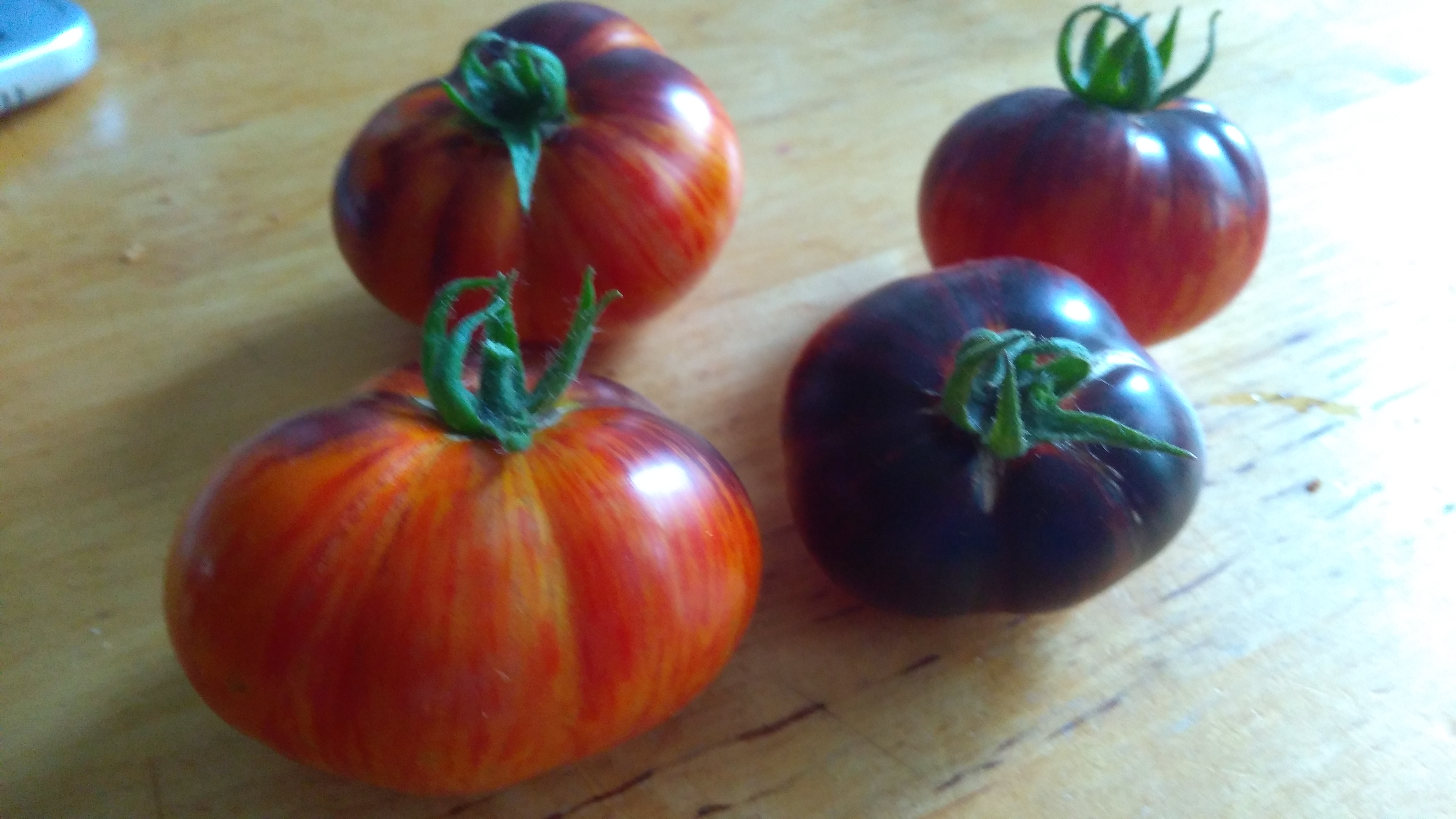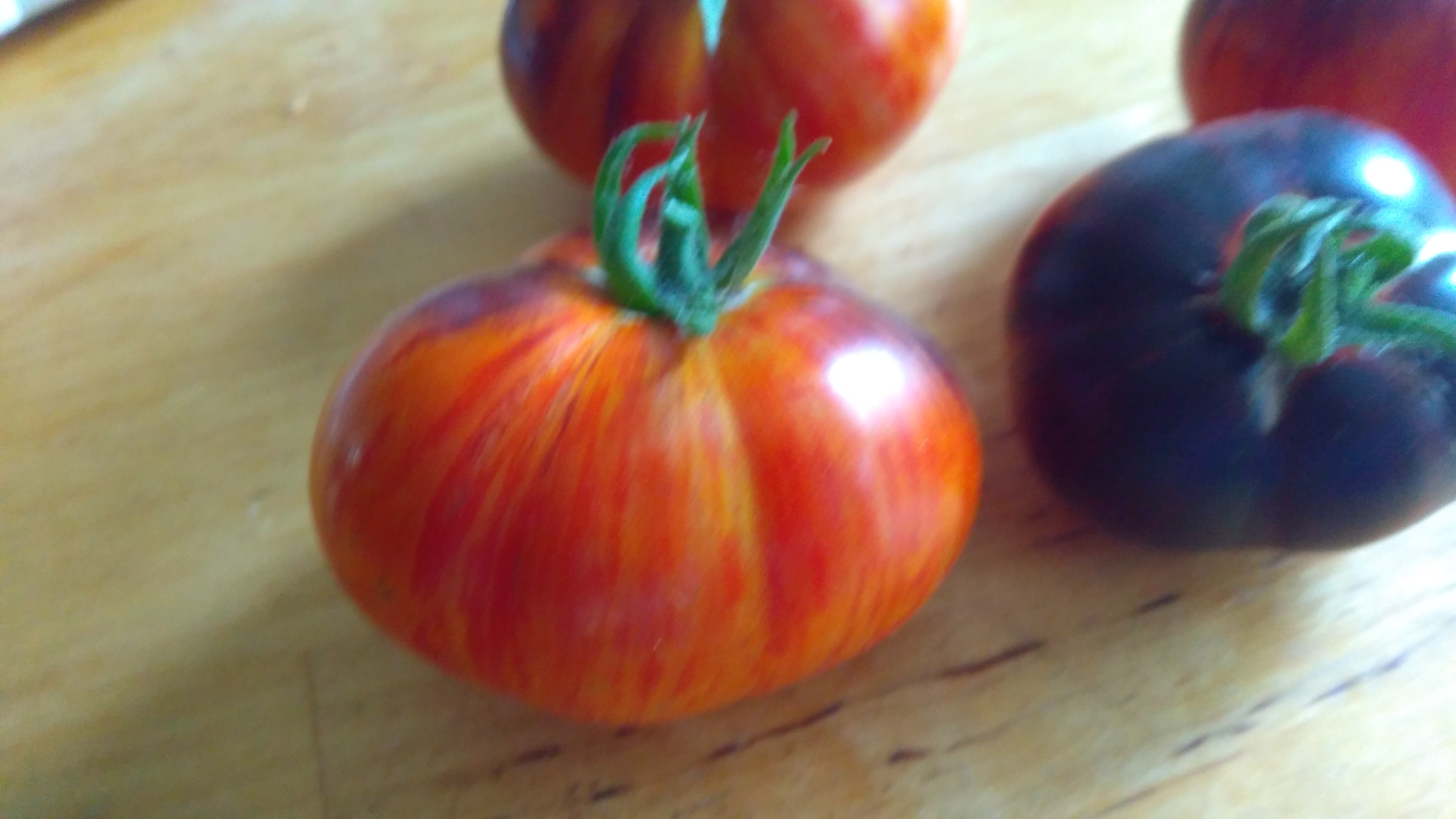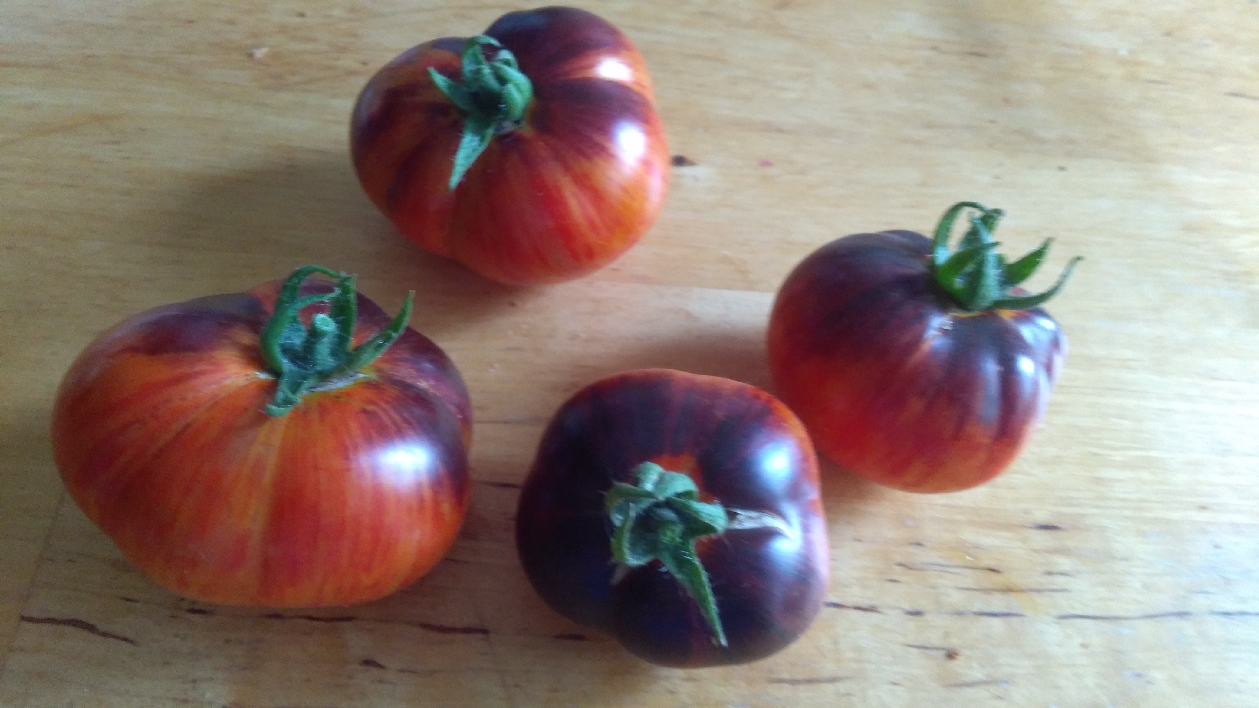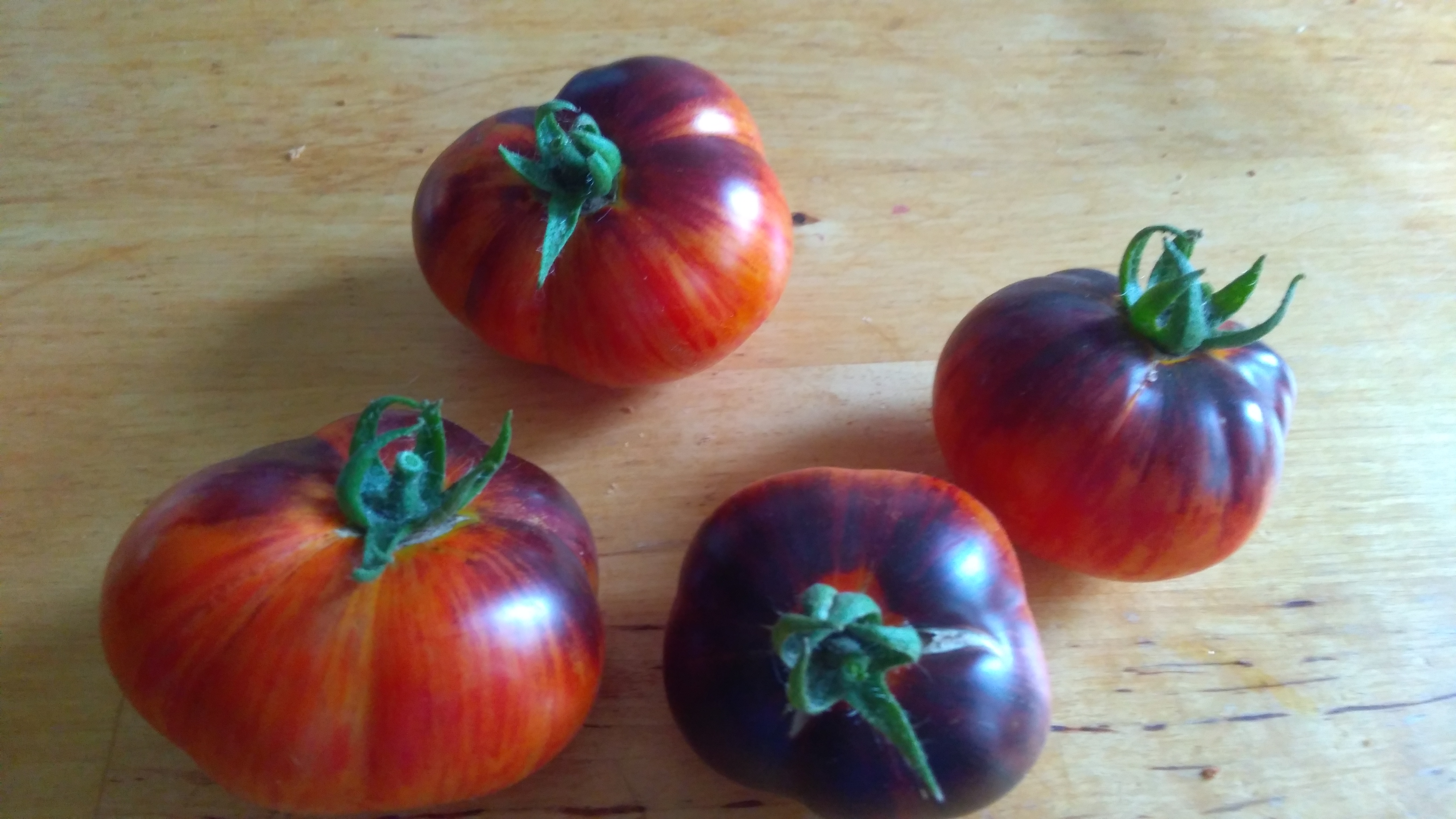 Rózsaszín, narancs, lila, zöld csíkok jellemzik. Amerikai szaftos, ízletes fajta. Féldeterminált, bőtermő, júliustól a fagyokig érik.